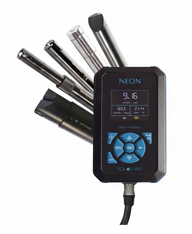 Neon es un dispositivo portátil combinado con el sensor OPTOD, que permite leer el oxígeno disuelto en %Sat y mg/L, así como la temperatura.